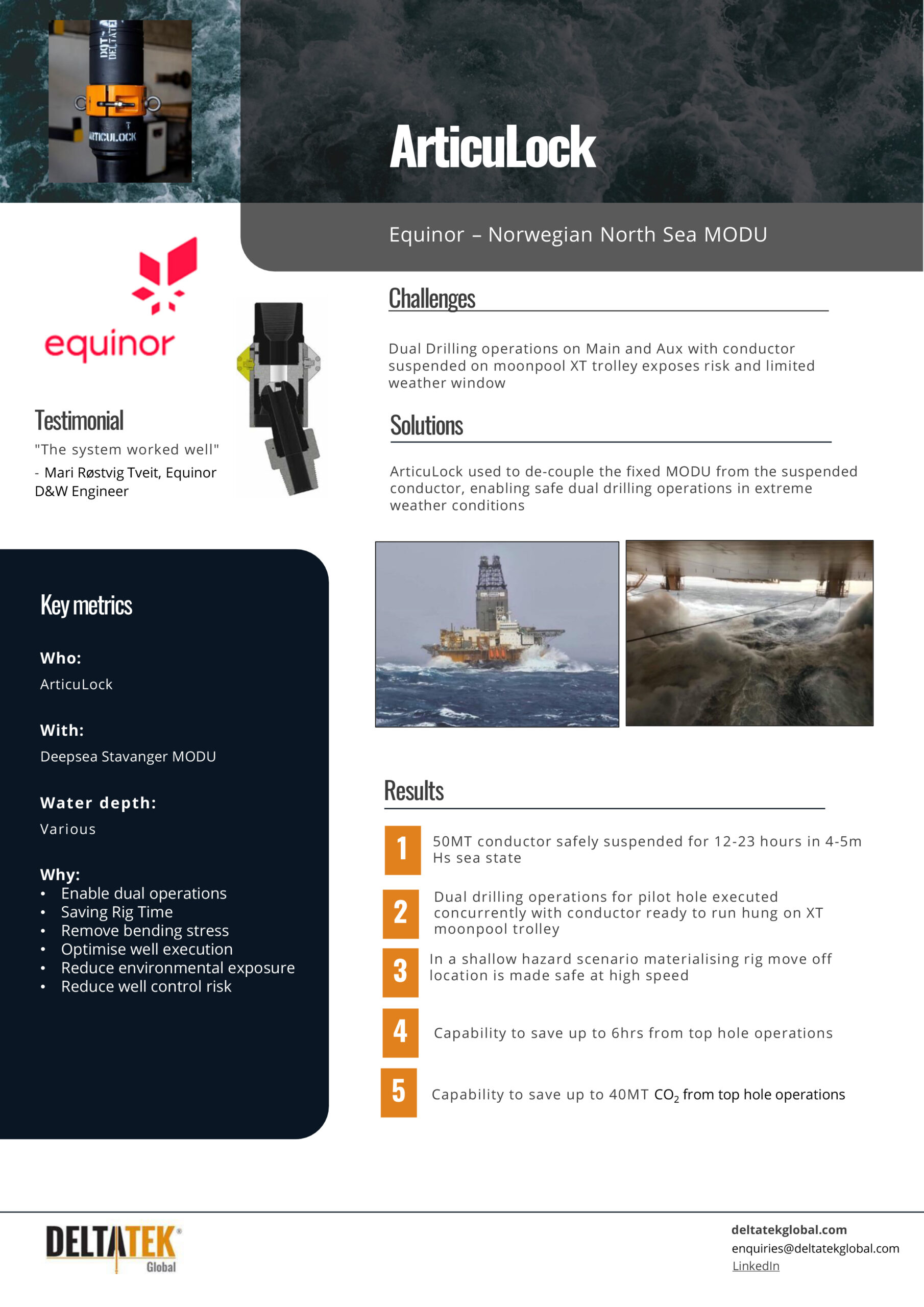 - Extend the weather window for deployment of subsea trees, flow-bases, emergency disconnect package (EDP)/lower riser package (LRP) or casing strings etc by >400%